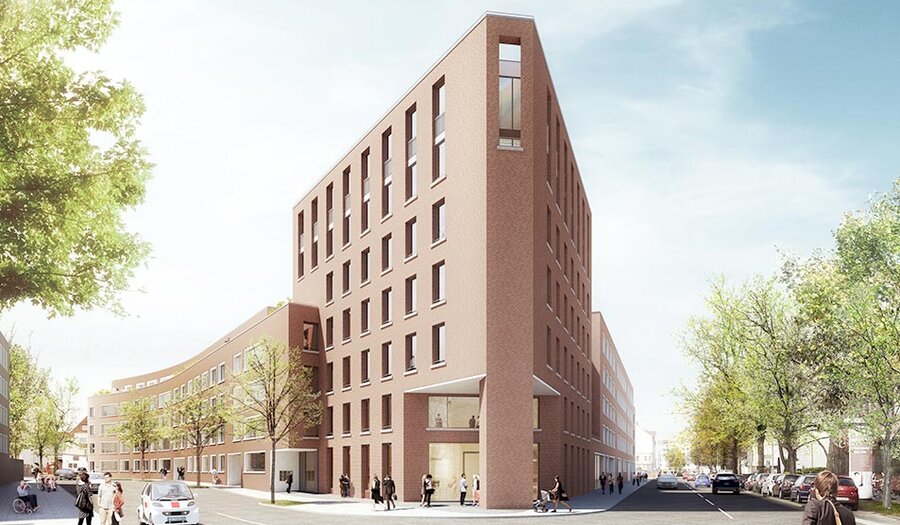 Das Gebäude zeigt eine dem Verlauf der angrenzenden Straßen angepasste Gebäudekonfiguration in Form einer Blockrandbebauung auf, die einen geschützten Innenhof mit einer Größe von ca. 1.375 m2 umschließt. Die unterschiedlichen Rahmenbedingungen der drei Seiten des Grundstücks finden Ihren Widerhall in der Gebäudeplanung. Der Bau schließt die Entwicklung der ursprünglich brachliegenden etwa 131.000 Quadratmeter großen Gesamtfläche weitgehend ab.