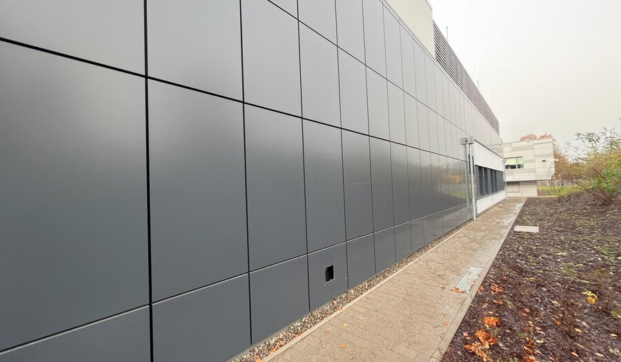 Im Außenbereich wurde dabei ein umlaufender Fußweg, befestigte Parkplätze, die Zufahrt bzw. der Anlieferbereich zu einer Netzersatzanlage sowie Erschließungswege zum Gebäude vorgesehen. Das Rechenzentrum hat eine Größe von rd. 500 m² BGF und ist ebenerdig. Auf dem Dach wurde die benötigte Klima- und Raumlufttechnik installiert.